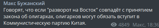 "Говорят, что если "разворот на Восток" совпадёт с принятием закона об олигархах, олигархов могут обязать вступит в Коммунистическую партию Китая".