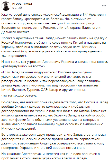 "Друзья, не смейтесь пожалуйста с заявления А. Арестовича о "развороте на Восток". Это все серьезно.