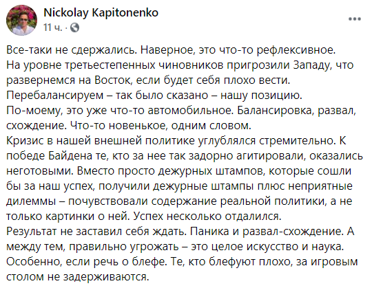 Кризис в нашей внешней политике углублялся стремительно. К победе Байдена те, кто за нее так задорно агитировали, оказались неготовыми. Вместо просто дежурных штампов, которые сошли бы за наш успех, получили дежурные штампы плюс неприятные дилеммы – почувствовали содержание реальной политики, а не только картинки о ней. Успех несколько отдалился.