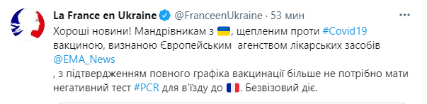 "Хорошие новости! Путешественникам из Украины, привитым против Covid-19 вакциной, признанной Европейским медицинским агентством, с подтверждением полного графика вакцинации больше не нужно иметь отрицательный тест ПЦР для въезда во Францию. Безвизовый режим действует", - говорится в сообщении.