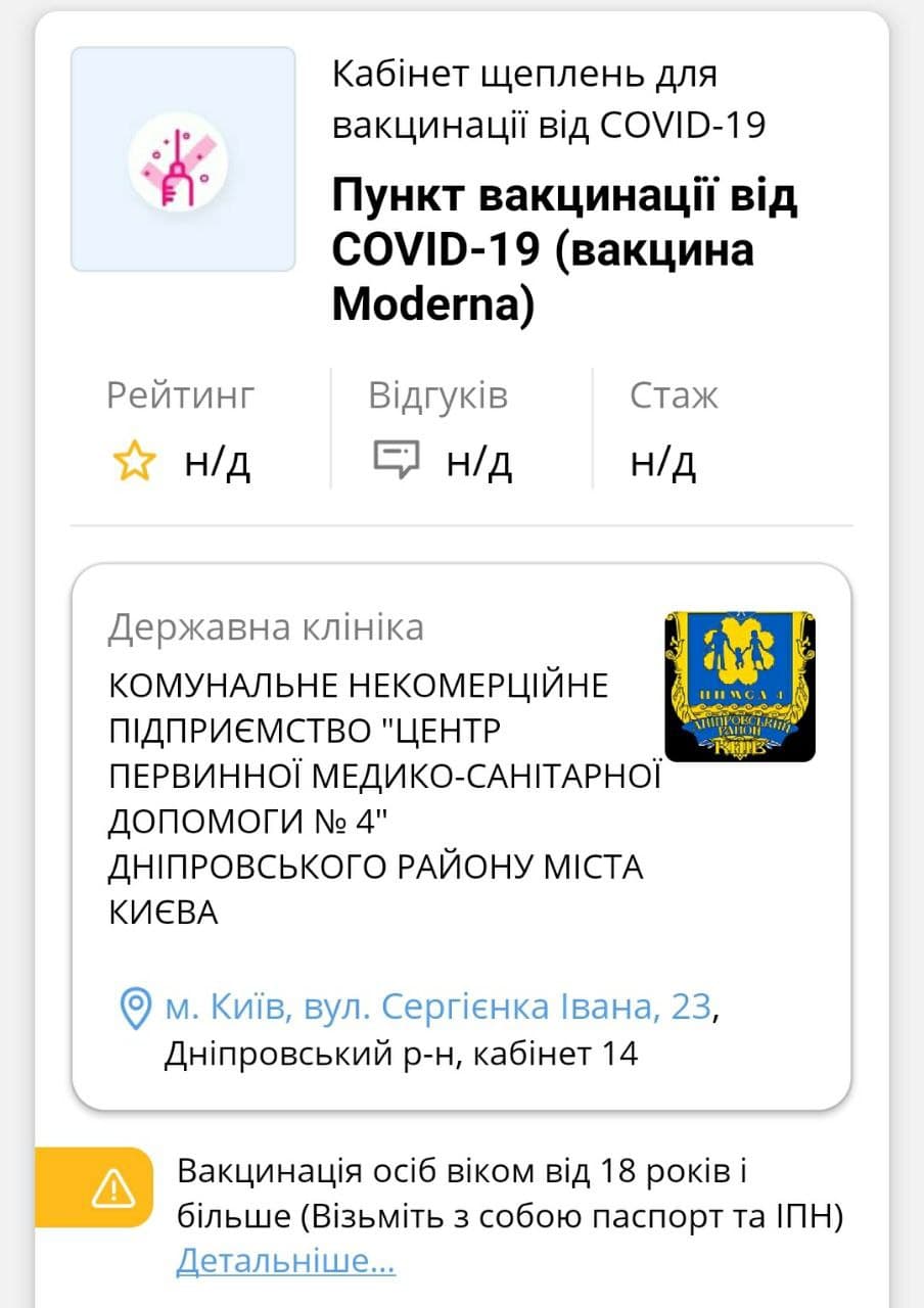 Также доступна запись на вакцинацию американской Модерной в Днепровском районе Киева.