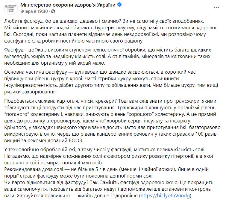 В МОЗ рассказали о связи между фастфудом и смертью от инфарктов и инсультов