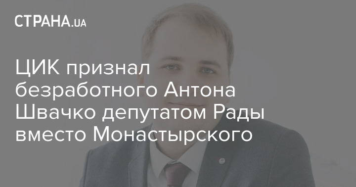 Центральная избирательная комиссия (ЦИК) признала избранным депутатом Верховной Рады от партии "Слуга народа" безработного Антона Швачко вместо Дениса Монастырского, назначенного министром внутренних дел.
