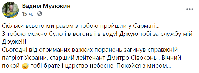 "Сколько всего мы вместе с тобой прошли в "Сармате" ... С тобой можно было и в огонь, и в воду! Благодарю тебя за службу мой друг. Вечный покой тебе, брат, и Царство Небесное. Покойся с миром", - сообщается в опубликованном сообщении.