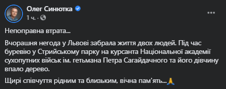 "Во время урагана в Стрыйском парке на курсанта Национальной академии сухопутных войск им. гетмана Петра Сагайдачного и его девушку упало дерево", - написал он, выразив соболезнования близким погибших.