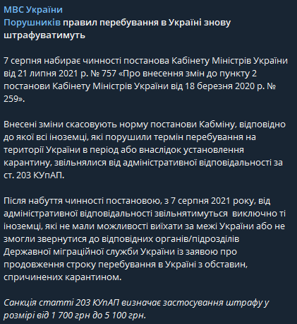 С 7 августа, когда постановление вступит в силу, от административной ответственности, соответственно и штрафов будут освобождены только те иностранные граждане, у которых не было возможности покинуть Украину или они по каким-либо причинам не смогли обратиться в соответствующие органы или Государственную миграционную службу Украины с заявлением о продлении срока пребывания в нашей стране по обстоятельствам, вызванных карантинными ограничениями.