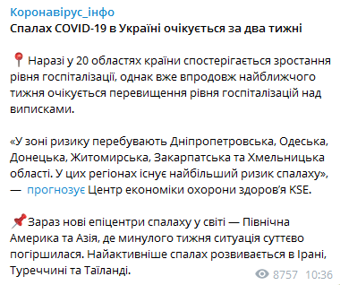 По данным Центра экономики охраны здоровья KSE, вспышка коронавируса, вероятнее всего, произойдет в Одесской, Житомирской, Хмельницкой, Закарпатской, Донецкой и Днепропетровской областях.