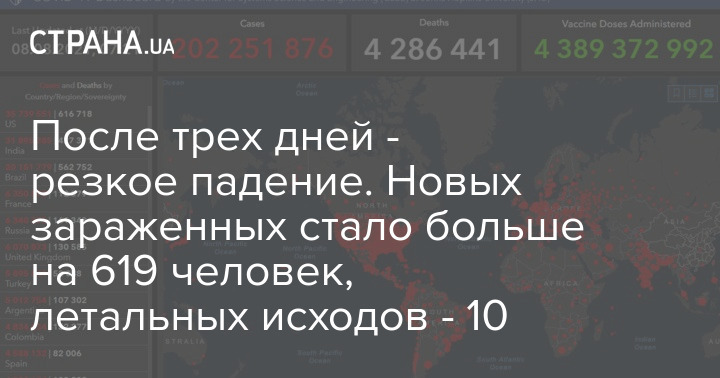 После трех дней - резкое падение. Новых зараженных стало больше на 619 человек, летальных исходов - 10