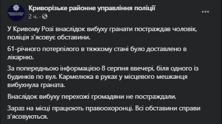 В Кривом Роге из-за взрыва гранаты пострадал 61-летний местный житель. Он пришел на проходную завода с гранатами, на одну сел, а вторую держал в руке. Переговоры не привели к успеху, он отпустил гранаты и они взорвались. Местные журналисты сообщают, что человек с гранатой - ветеран АТО.