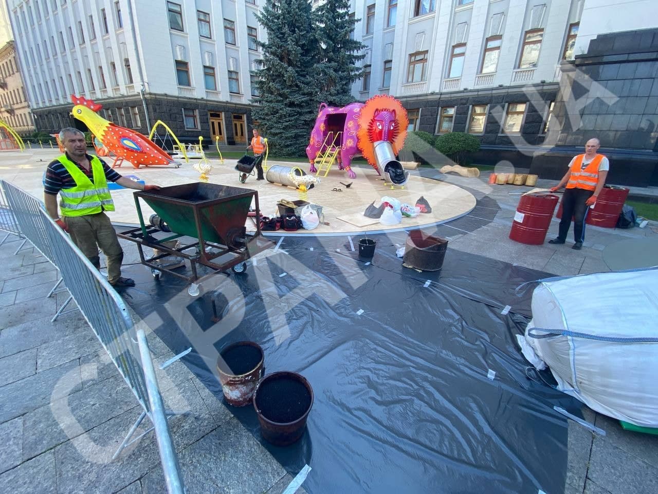 Под стенами Офиса президента появилась площадка с петухом в косоворотке. Ее откроют к Дню Независимости. Видео