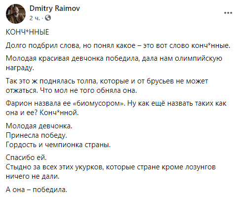 Ведущая "112 Украина" Евгения Скорина недоумевает: "В каком еще государстве, называющем себя демократическим, критикуют своих спортсменов и обзывают их биомусором? Возможно, ярые возмущения этих глубокоуважаемых граждан поспособствовали развитию и укреплению государства? Когда? Где?"