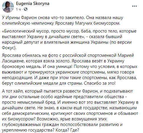 В наиболее грубой форме выступила украинизаторша и экс-нардеп от "Свободы" Ирина Фарион. Она назвала Ярославу "биомусором" и предложила НОК Украины отобрать у нее медаль.