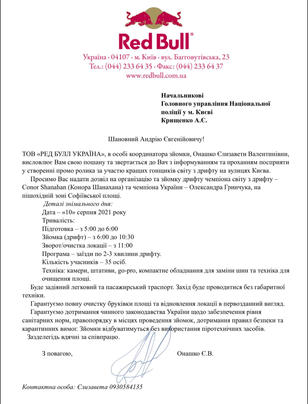 Также заместитель главы КГГА опубликовал обращение ТОВ "Ред булл Украина" к начальнику главного управленя Нацполиции в Киеве Андрею Крищенко. В нем координатор торговой марки Елизавета Онищенко просит разрешение на съемки, добавив, что ТОВ "Ред булл Украина" "гарантирует полную очистку площади и восстановление локации в первоначальный вид".