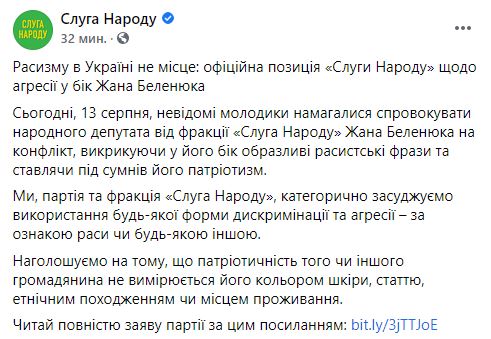 "Пошда реакция властей на попытку нападения на Беленюка с расистскими оскорблениями. Полиция начала расследование. А партия "Слуги народа" выпустила заявление, в котором нападение на Беленюка названо актом агрессии на почве расизма.