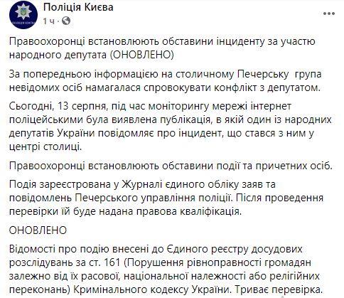 В полиции уже заявили, что устанавливают обстоятельства происшествия и причастных к этому лиц. Происшествие зарегистрировано в журнале Единого учета заявлений и сообщений Печерского управления полиции. В итоге происшествие квалифицировали по ст 161 (нарушение равноправия граждан из-за их расовой принадлежности или религиозных убеждений).