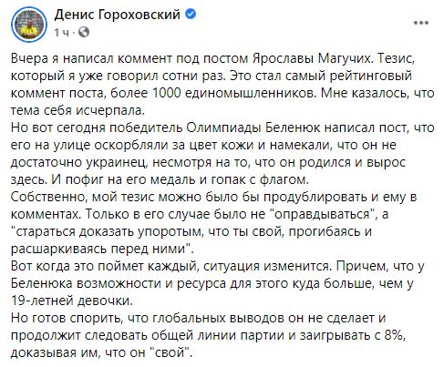 Но вот сегодня победитель Олимпиады Беленюк написал пост, что его на улице оскорбляли за цвет кожи и намекали, что он не достаточно украинец, несмотря на то, что он родился и вырос здесь. И пофиг на его медаль и гопак с флагом.