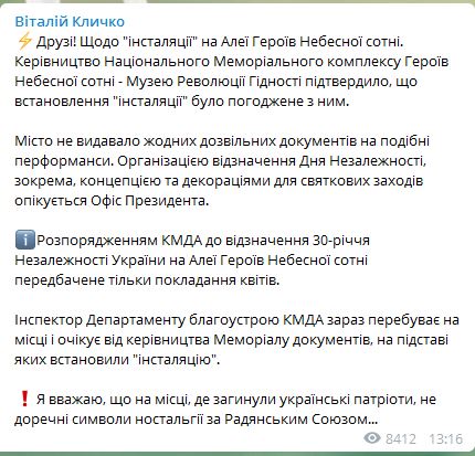 "Я считаю, что на месте, где погибли украинские патриоты, неуместны символы ностальгии по Советскому Союзу" - написал Кличко в Telegram-канале.