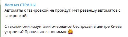 "Автоматы с газировкой не пройдут! Нет реваншу автоматов с газировкой! С такими они лозунгами очередной беспредел в центре Киева устроили? Правильно я понимаю?" - написала спецкорреспондент "Страны" Олеся Медведева.