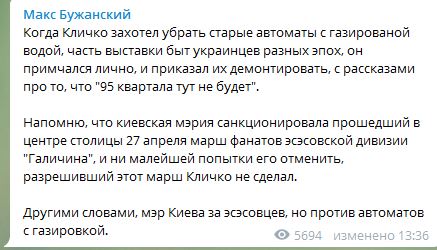 Другими словами, мэр Киева за эсэсовцев, но против автоматов с газировкой" - написал депутат от "Слуги народа" Максим Бужанский.