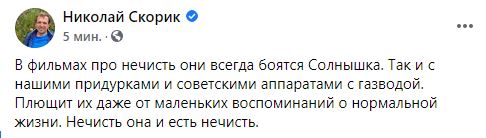 "В фильмах про нечисть они всегда боятся Солнышка. Так и с нашими придурками и советскими аппаратами с газводой. Плющит их даже от маленьких воспоминаний о нормальной жизни. Нечисть она и есть нечисть" - написал нардеп от ОПЗЖ Николай Скорик.