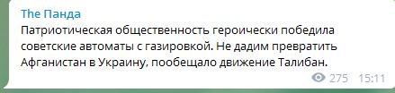 "Патриотическая общественность героически победила советские автоматы с газировкой. Не дадим превратить Афганистан в Украину, пообещало движение Талибан" - написал журналист Вячеслав Чечило.