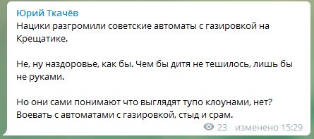 "Нацики разгромили советские автоматы с газировкой на Крещатике. Не, ну на здоровье, как бы. Чем бы дитя не тешилось, лишь бы не руками. Но они сами понимают что выглядят тупо клоунами, нет? Воевать с автоматами с газировкой, стыд и срам" - прокомментировал журналист Юрий Ткачев.