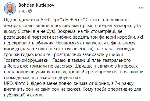 На Алее Героев Небесной Сотни также появился директор "музея Революции Достоинства" Игорь Пошивайло и заявил, что концепцию инсталляций с музеем не согласовывали.