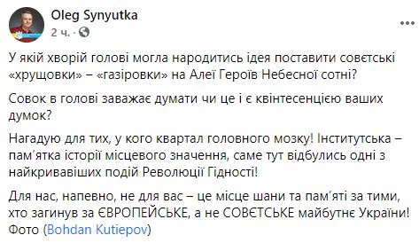 Экс-губернатор Львовской области и кандидат от партии Порошенко на выборах мэра Олег Синютка написал, что только в больной голове могла родиться идея поставить советские "хрущевки"-"газировки" на Аллее Героев Небесной сотни.