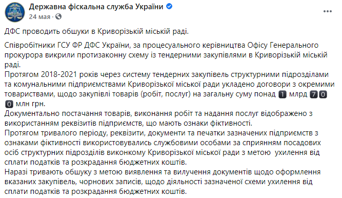 Следующий раунд правоохранительной активности в криворожской мэрии произошел 24 мая. На этот раз чиновников заподозрили в проведении фиктивных тендеров почти на два миллиарда гривен.
