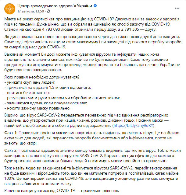 Медики объяснили, зачем вакцинированным от коронавируса украинцам носить маску