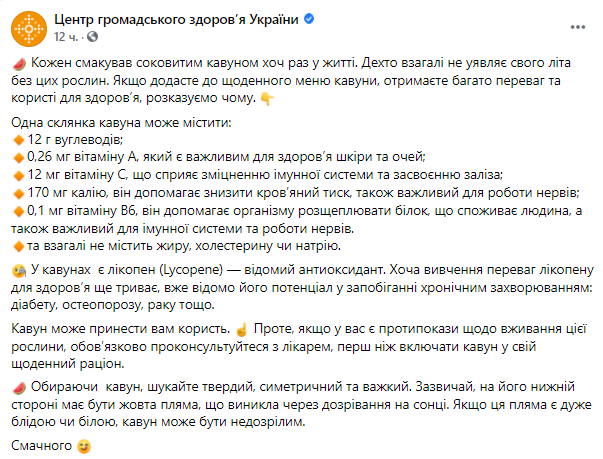 Медики рекомендуют украинцам добавить в ежедневное меню арбузы, сезон которых сейчас как раз в разгаре. Даже небольшое количество этого летнего лакомства, которое не содержит жира, холестерина и натрия, может обеспечить организм нужными витаминами и микроэлементами. В арбузах есть антиоксидант ликопен (Lycopene), который способен противостоять хроническим заболеваниям: диабету, остеопорозу, раку и другим. Об этом сообщает Центр общественного здоровья при Минздраве.