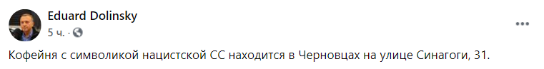 Глава Украинского еврейского комитета Эдуард Долинский сообщил, что в Черновцах в кофейне "ESCOBAR COFFEE", расположенной на улице Синагоги, 31, используют в Черновцах символику нацистской СС.