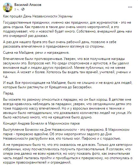 Журналист Василий Апасов проанализировал мероприятия ко Дню Независимости и сделал резюме. Впечатления от них у него остались противоречивые.