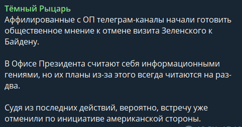 "Аффилированные с ОП телеграм-каналы начали готовить общественное мнение к отмене визита Зеленского к Байдену.