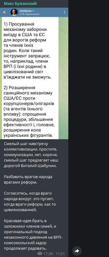 "Продвижение механизма запрета выезда в США и ЕС для врагов реформ и членов их семей. Когда такой инструмент заработает, то, например, члены ВСП (и их семьи) в цивилизованный мир въезжать не смогут", -  рассуждает Шабунин.
