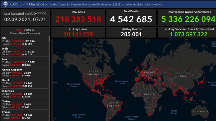 По данным на утро 2 сентября число зараженных на Земле перевалило за 218 миллионов, фото arcgis.com