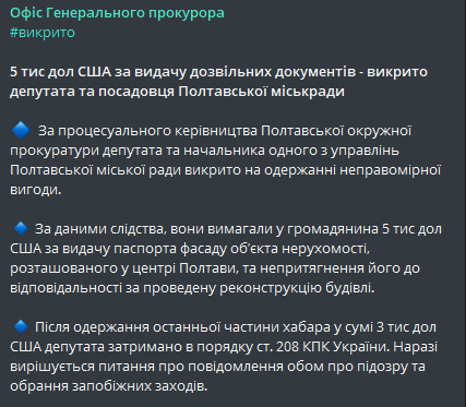 "5 тыс долл США за выдачу разрешительных документов - разоблачен депутат и чиновник Полтавского горсовета. В соответствии с процессуальным руководством Полтавской окружной прокуратуры, депутат и начальник одного из управлений Полтавского городского совета разоблачены на получении неправомерной выгоды.