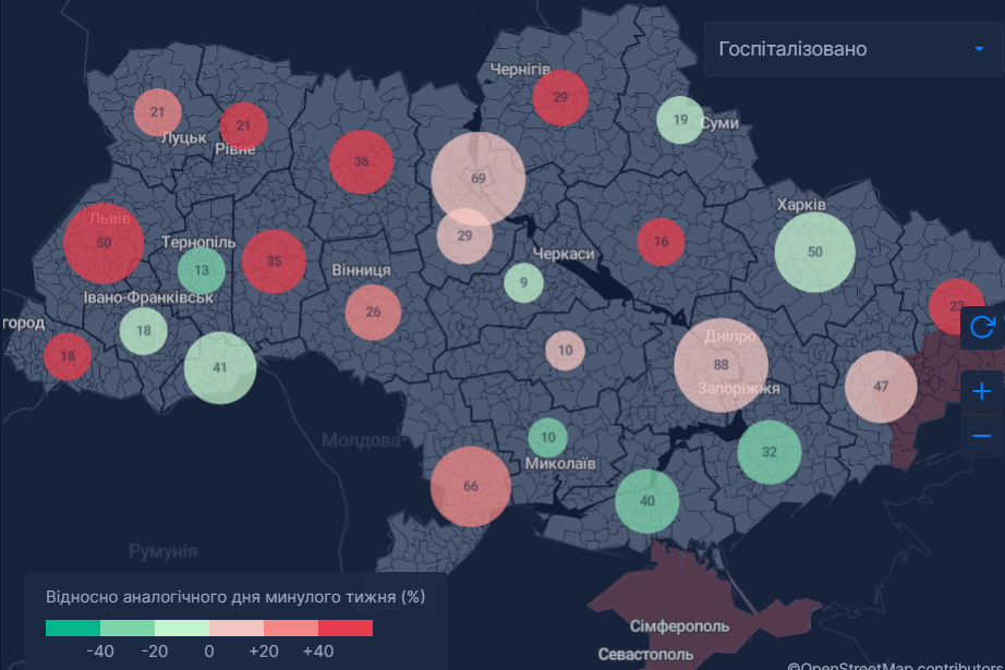 С высокой динамикой госпитализации сегодня выросли в восьми областях: Львовская, Закарпатская, Ровненская, Хмельницкая, Житомирская, Черниговская, Полтавская, Луганская (на карте отмечены красным кружочком).