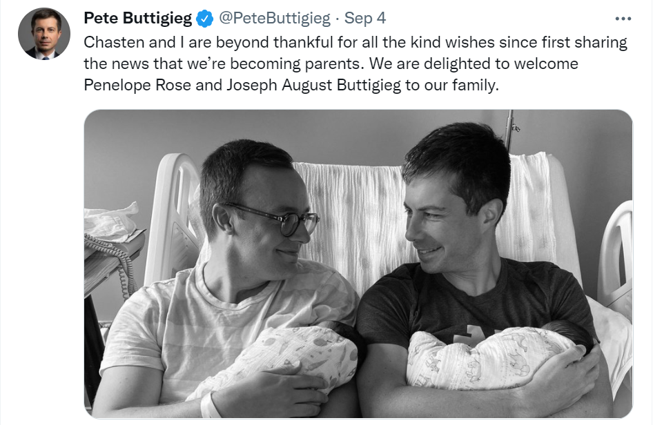 Министр транспорта США Питер Буттиджич, который является открытым геем, вместе со своим партнером Чэстеном приняли в семью двух новорожденных детей.