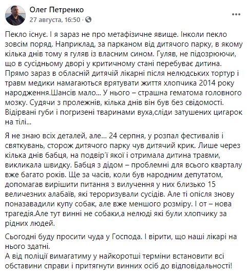 "Бабка с дедом - проблемные для всего квартала уже много лет. Еще во времена, когда был народным депутатом, помогал решить вопрос по изъятию у них около 15 огромных алабаев, которые терроризировали соседей. Но те снова поназаводили кучу собак, но уже меньшего размера. И вот - новая трагедия. Но здесь виноваты не собаки, а изверги, которые были мальчику за родных людей", - написал он.