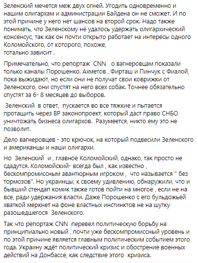 Опубликование CNN репортажа по вагнеровцам сразу после визита Зеленского в США означает, что администрация Байдена оказалась крайне недовольной результатами встречи. Зеленскому однозначно дали понять, что ему придется очень серьезно потрудиться, чтобы получить ярлык на второй срок.
