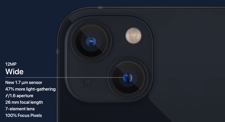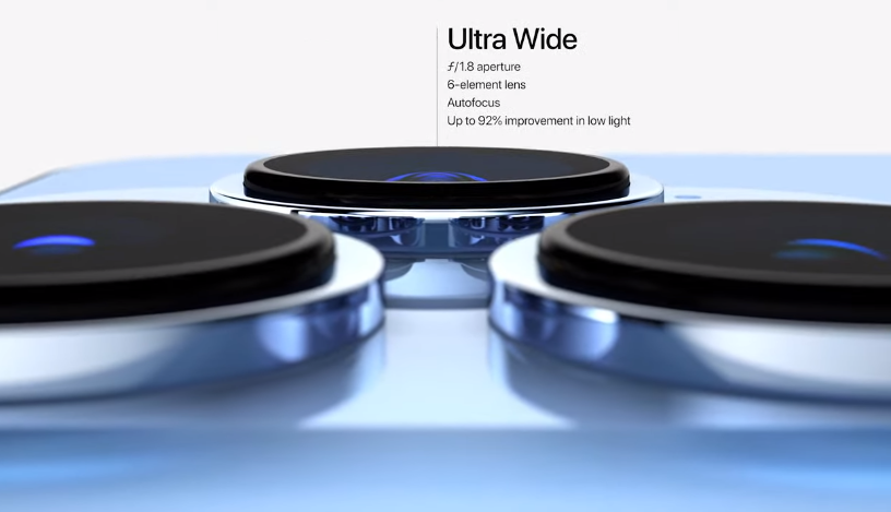 Это трехобъективная камера с телеобъективом 77 мм с 3-кратным оптическим увеличением (ранее в iPhone 12 Pro Max было 2,5-кратное увеличение) и сверхширокоугольная камера f/1.8, а также широкая камера f/1.5 с пикселями 1.9 микрон.