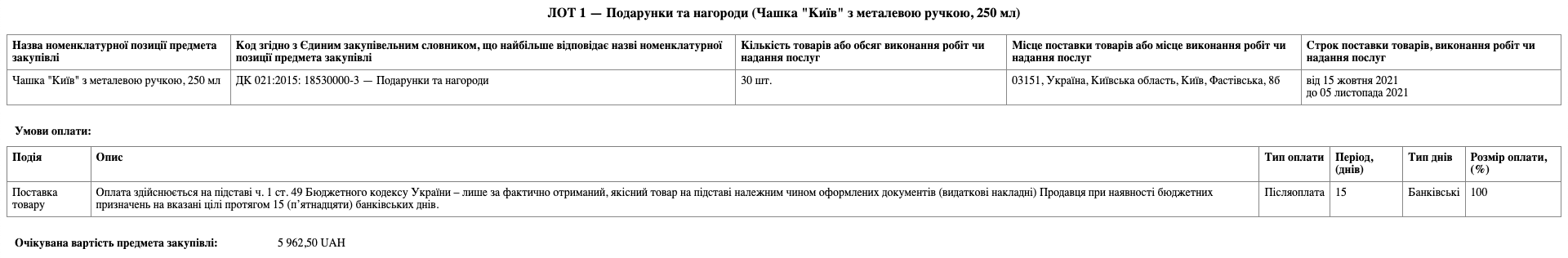 Кроме того, СБУ желает за почти шесть тысяч гривен купить 30 чашек с металлической ручкой. Их также должны поставить до 5 ноября.