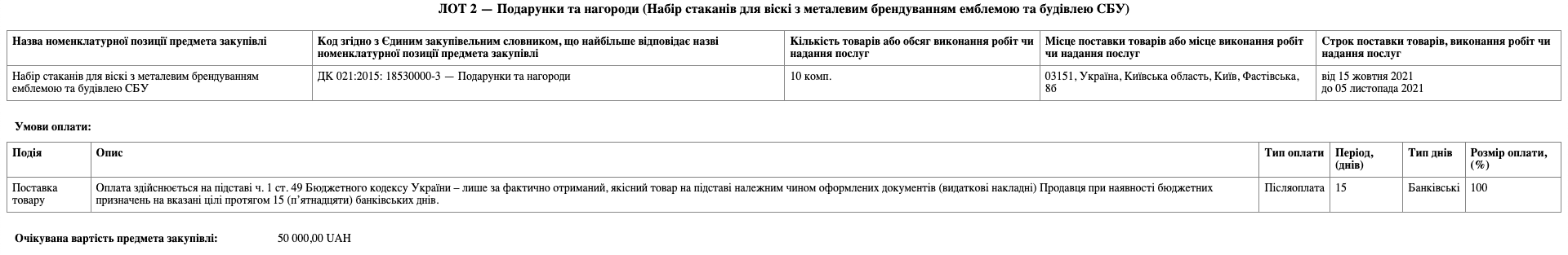 Служба безопасности Украины намерена купить через систему закупок ProZorro десять подарочных наборов стаканов для виски, на которых будет изображено здание ведомства.