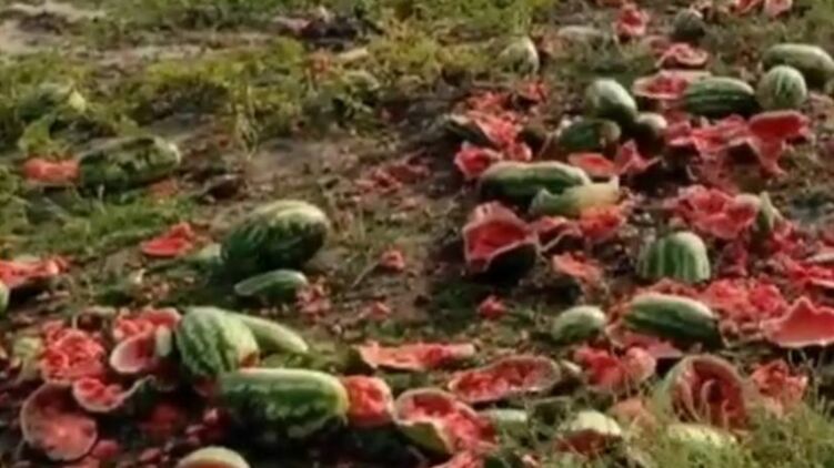 В сети опубликовано видео, на котором запечатлено, как фермеры уничтожают непроданные арбузы, попросту разбрасывая их по полю из грузовика. Огромные ягоды разбиваются о землю, укрывая ее красным "ковром". Собственники урожая считают лучшим выходом пустить нереализованные арбузы на удобрения. Сообщается, что действие происходит в селе Михайловка Херсонской области.