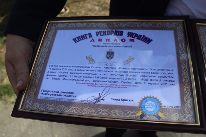 Главе Веселовской громады представители "Книги рекордов Украины" вручили сертификат, подтверждающий, что 11 сентября 2021 года в поселке Веселое зафиксировали новый рекорд Украины в категории "Размеры, искусство", а именно: официальное открытие крупнейшей в мире скульптуры пчелы.