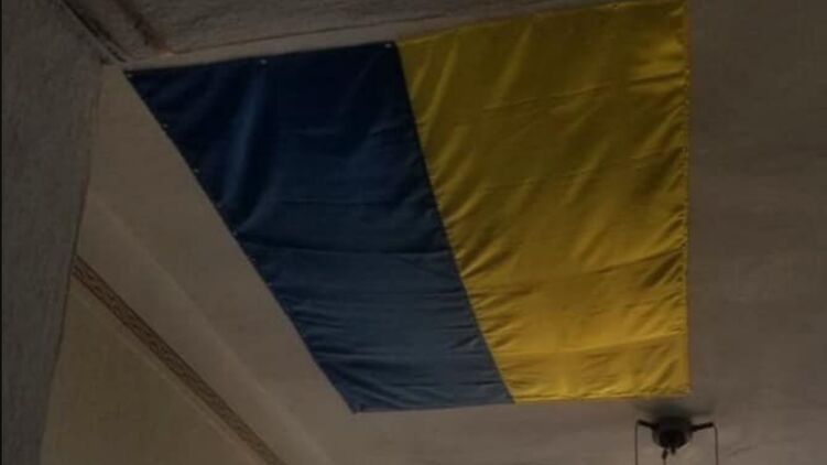 В здании Николаевской районной государственной администрации дыру в потолке завесили флагом Украины. Фото