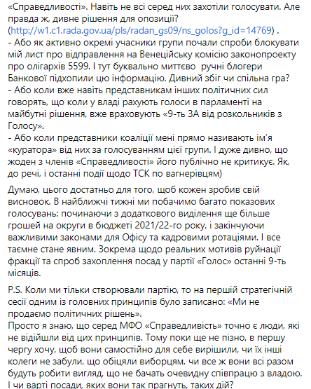 Также в письме добавили, что "поскольку фракция "Голос" не проводила заседания несколько месяцев подряд, письма Ярослава Железняка, которые он подписывает от имени фракции, являются нелегитимными и имеют признаки превышения служебных полномочий. Это в том числе касается письма, которое Ярослав Железняк направил в голову парламента Дмитрия Разумкова относительно так называемого антиолигархического законопроекта 5599".