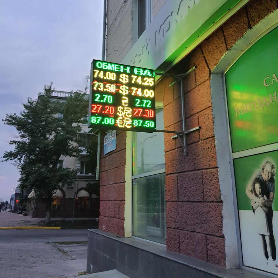 Фото: Обменник с актуальным курсом валют. Значения на табло указаны в российских рублях