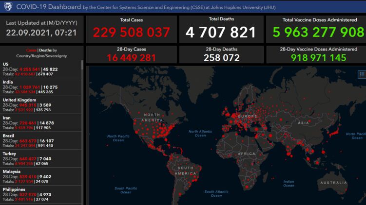 По данным на утро 22 сентября число зараженных на Земле приближается к 230 миллионам, фото arcgis.com